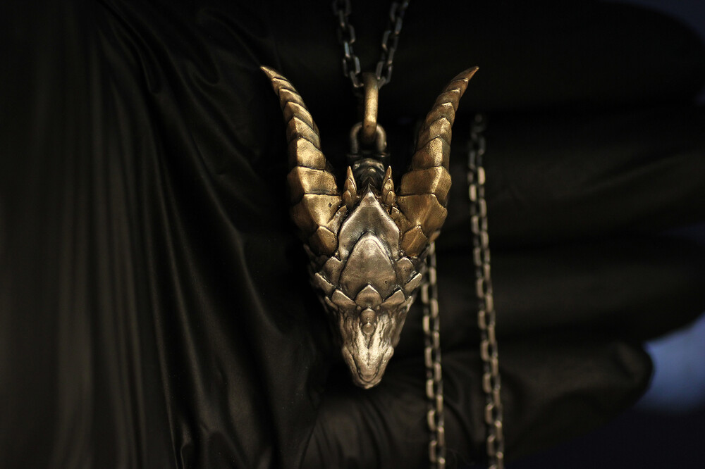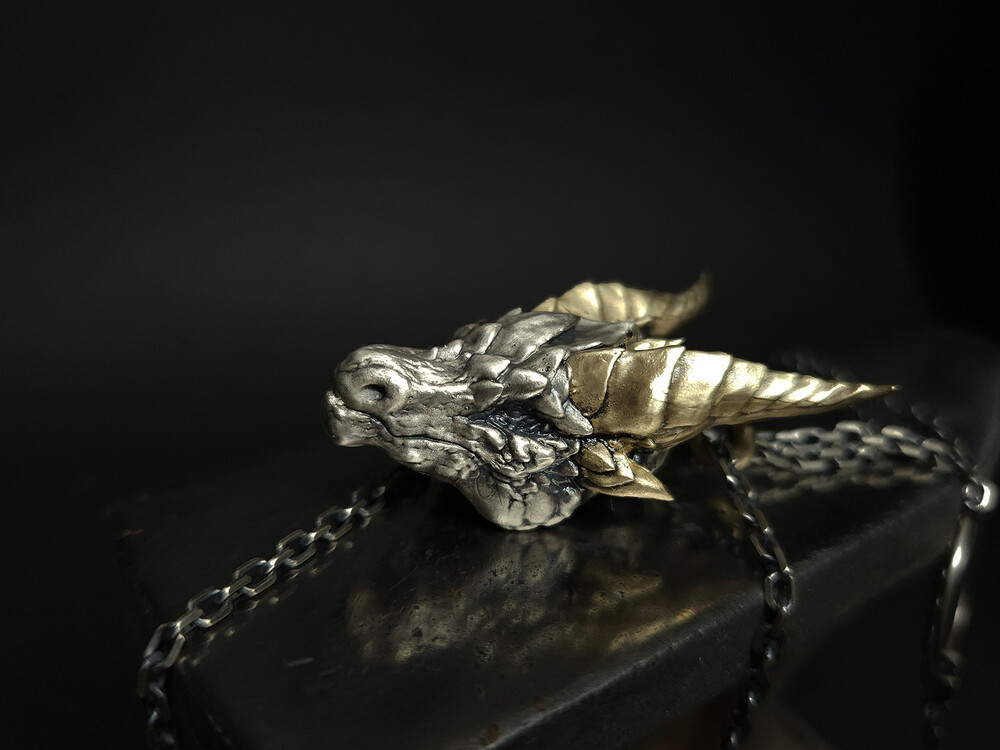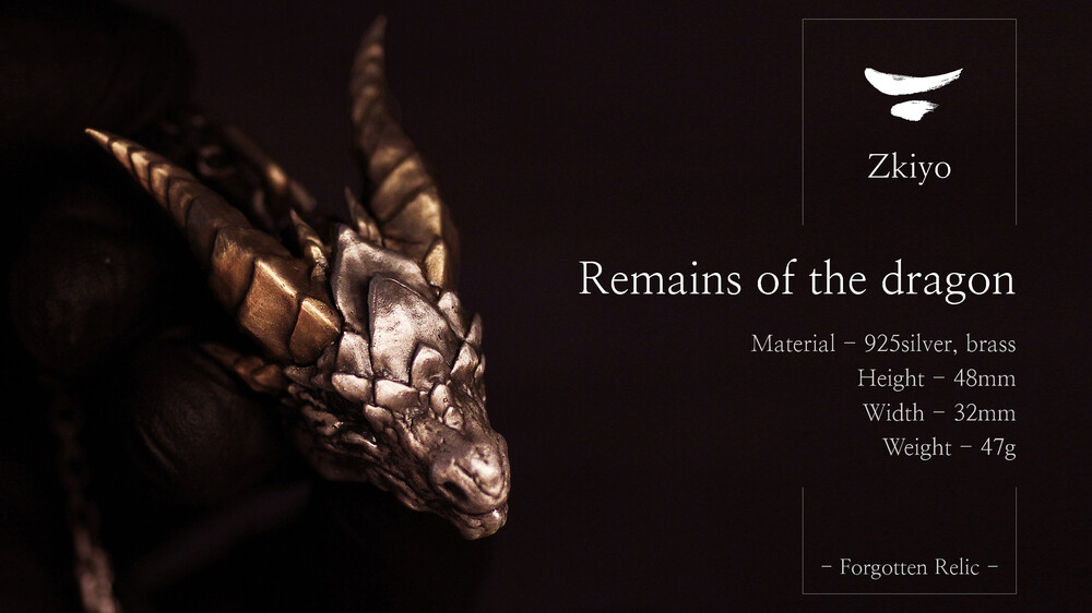 The pendant of the dragon's remains is crafted with solid silver, featuring a dragon head and horns made of brass. The pendant measures 5cm in length and provides a strong impression of the dragon. We hope you enjoy the feeling of having a piece of the dragon with you.